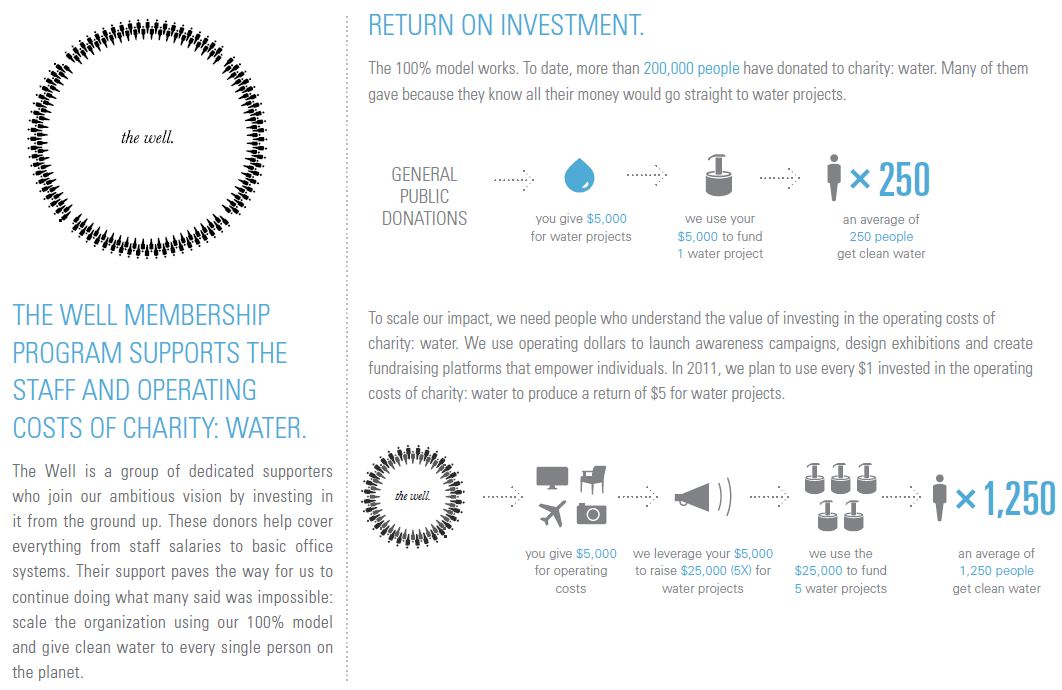 Tento model sa dobre osvedčil napríklad organizácii Charity Water, ktorá rovnako ako DA garantuje, že 100% darov od podporovateľov pôjde na projekty hĺbenia studní v rozvojovom svete. Svoju prevádzku financuje vďaka grantom a darcom združeným v „klube darcov“ nazvanom Well (studňa). Ide o oddaných a bohatých podporovateľov projektu, ktorí prispievajú na jeho prevádzku. V očiach organizácie majú zvláštne postavenie a to nielen tým, že sú uvádzaní v zvláštnej sekcii výročnej správy. Organizácia pristupuje k tomuto klubu darcov špecificky, podrobne ich informuje o chode organizácie, zapája ich do diskusií o plánoch a podobne. Polopatisticky povedané, ak vám niekto ročne venuje 12, 24, 60 či 120 tisíc dolárov, treba mu/jej venovať špeciálnu pozornosť.
