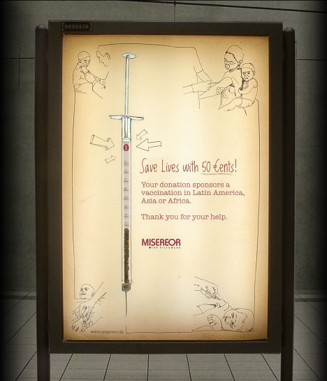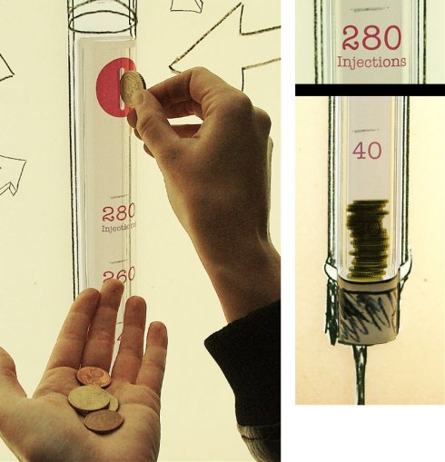Ďalší interaktívny poster vyzýval chodcov, aby prispeli 50 centami na injekcie – vhodené mince sa na posteri ukladali v podobe striekačky (čím ju postupne zapĺňali) a tým vytvárali zaujímavú podobu fundraisingového “teplomera”.