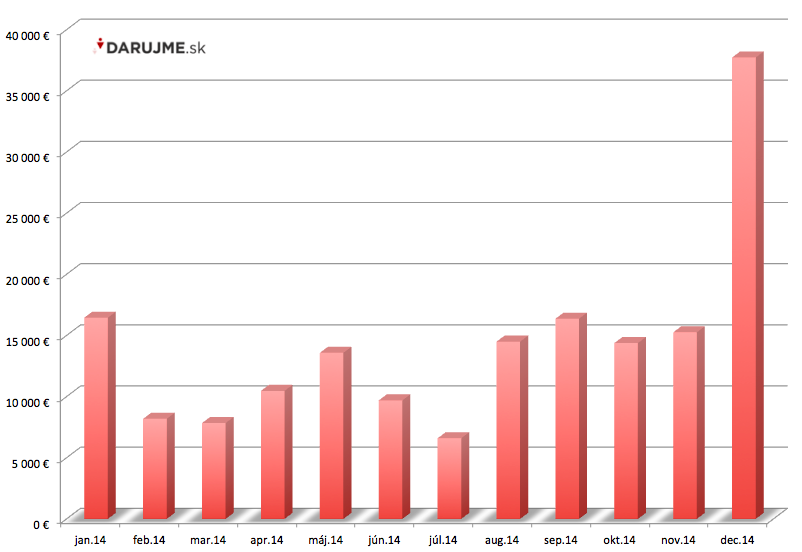V nasledujúcom grafe môžete vidieť, ako oproti iným mesiacom extrémne narástla suma darov, ktoré organizácie prijali práve v decembri 2014:
