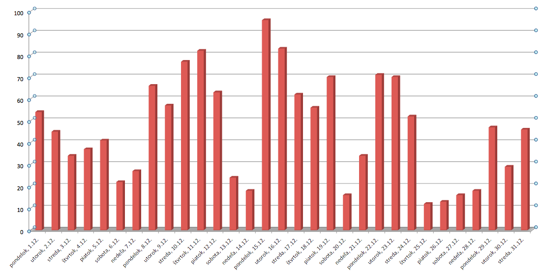 Na začiatok moje obľúbené štatistiky. Darcovská brána pre neziskovky DARUJME.sk funguje už tri roky a vďaka nárastu organizácií, ktoré ju používajú máme každým mesiacom viac a viac dát, ktoré ukazujú zaujímavé trendy v darovaní. Pozrieme sa teda, ako vyzeral minuloročný december, pričom použijeme dáta z roku 2014 a zahrnieme do nich iba organizácie, ktoré boli na DARUJME od januára 2014.